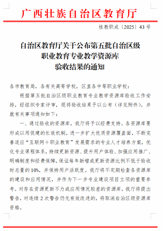 近日,自治区教育厅印发《关于公布第五批自治区级职业教育专业教学资源库验收结果的通知》(桂教职成〔2025〕43号),我校主持建设的园艺技术专业教学资源库顺利通过验收,标志着我校在园艺职业教育数字化建设领域取得重大突破,为区域现代园艺产业发展注入教育新动能。