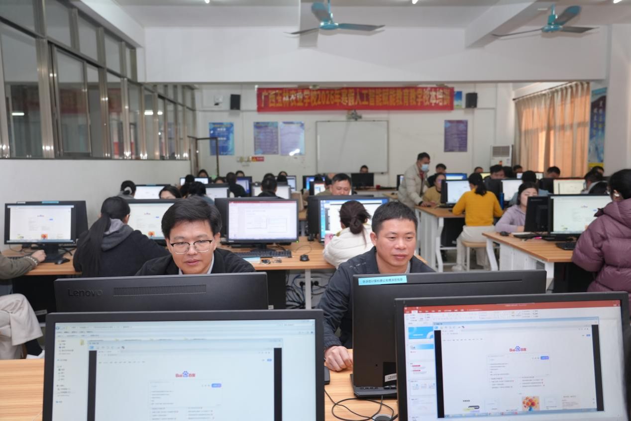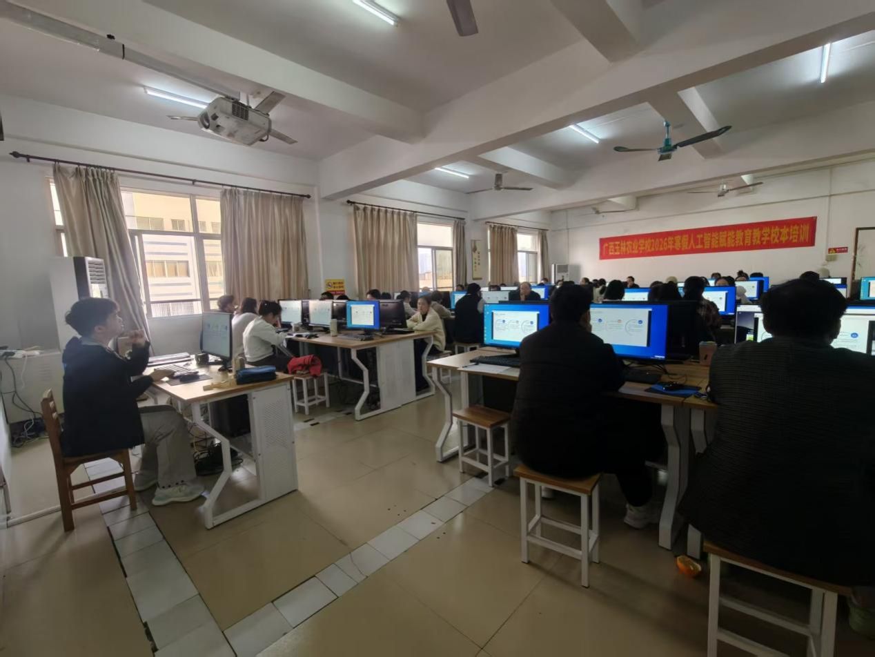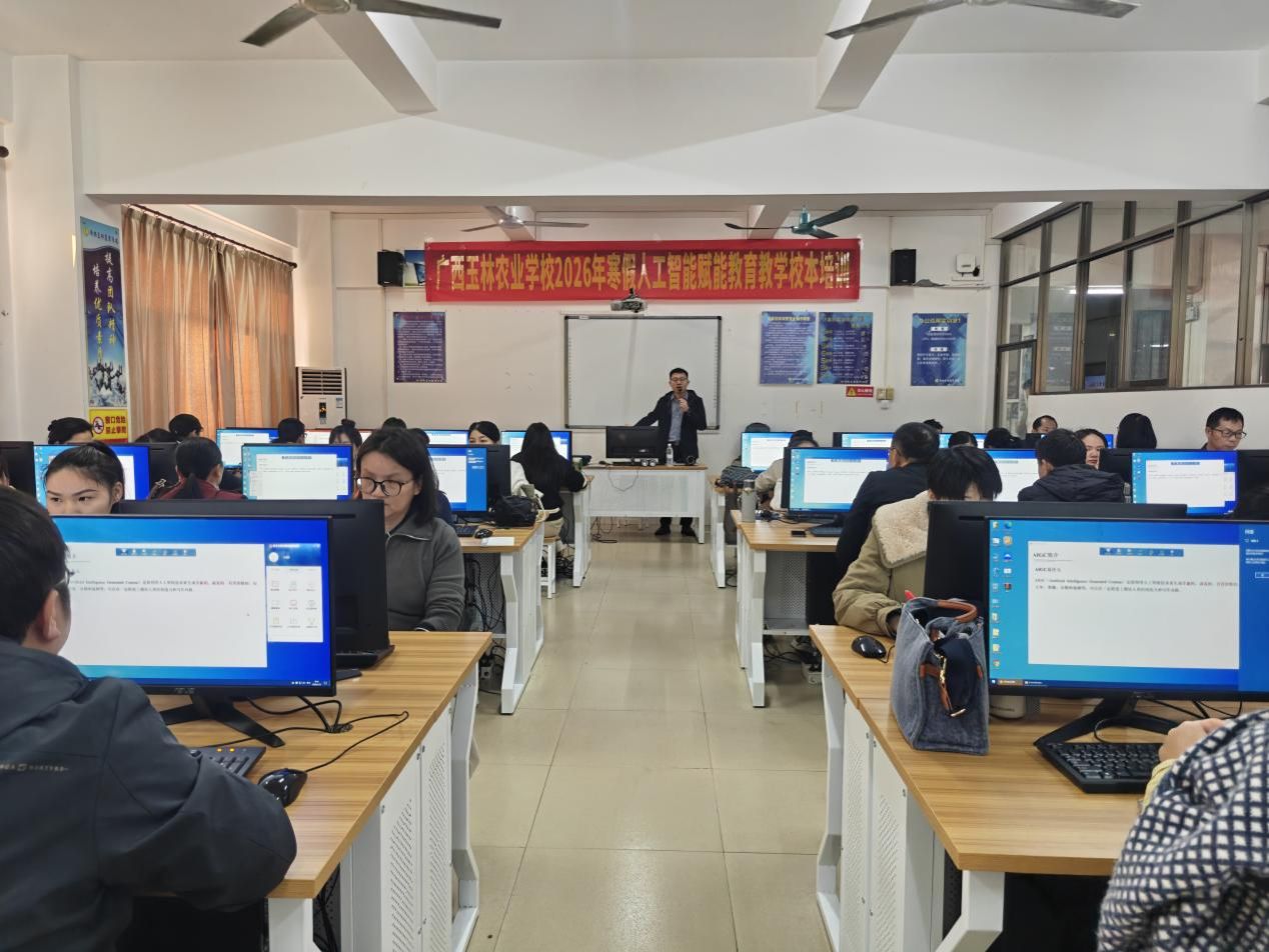 (通讯员:胡霞)为推动人工智能技术与教育教学深度融合,提升我校教师的数字化教学能力,助推教育数字化转型。1月15日,学校在知行楼计算机机房开展广西玉林农业学校2026年寒假人工智能赋能教育教学校本培训,180名骨干教师齐聚一堂,沉浸式学习人工智能技术在教育教学中的应用技巧。