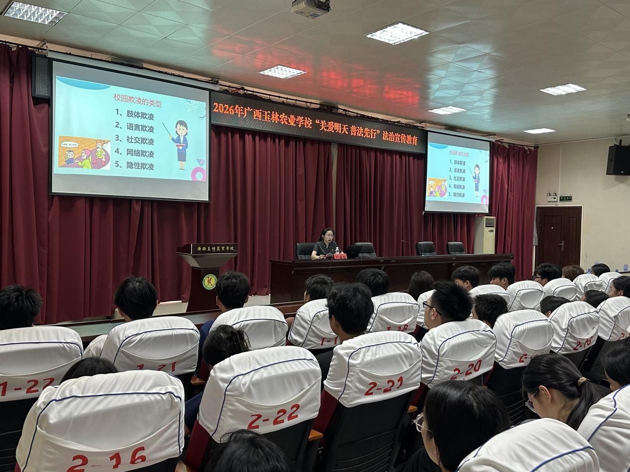 (通讯员:吕思宏)为深入推进青少年法治教育,筑牢校园安全防线,3月27日下午,我校特邀玉林市中级人民法院法官助理卢雨虹走进校园,开展“关爱明天 普法先行”法治宣传教育专题讲座。本次讲座重点解读自2026年1月1日起施行的新修订《中华人民共和国治安管理处罚法》,我校280余名学生代表到场参加讲座。